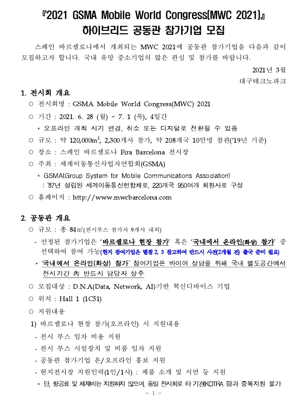 디바이스랩에서 2021년 MWC 하이브리드 공동관 참여기업을 모집하고 있네요. (G·캠프 무관)