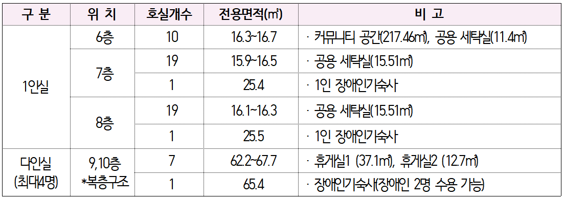 - 주거공간 총 58호실(1인실 50호실, 다인실 8실) + 공용공간 309.68㎡